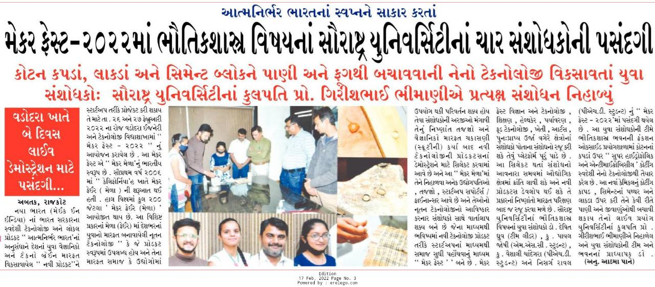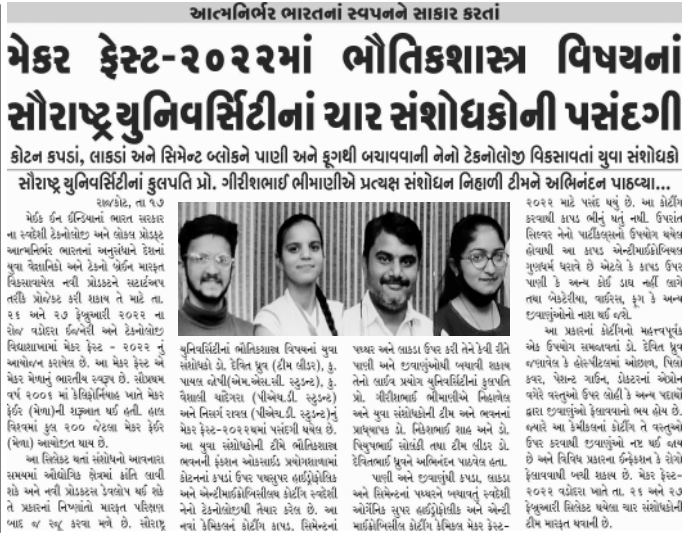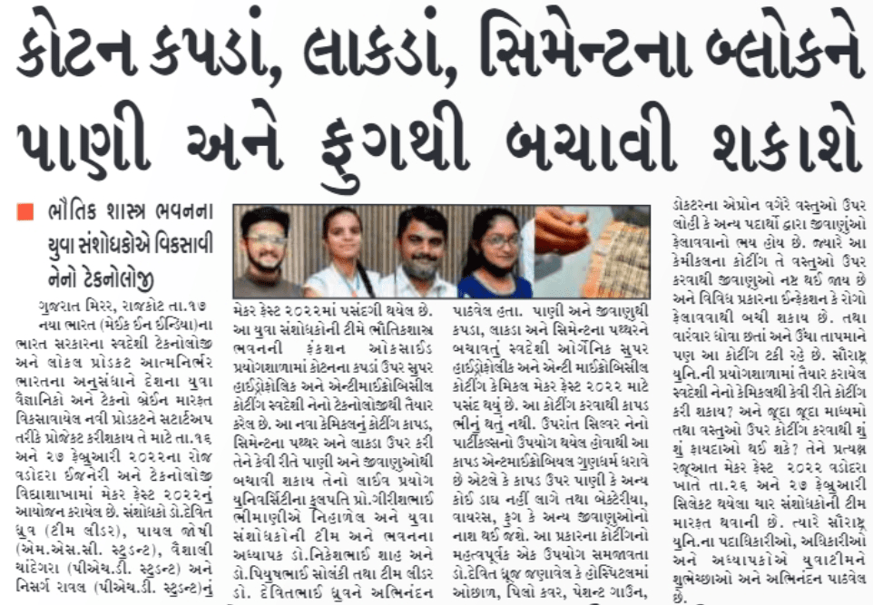 Fulchab - Team "Super hydrophobic And Anti Microbial Fabric" to receive "Silver Medal" at Makerfest held at Vadodara on 26th & 27th February 2022
